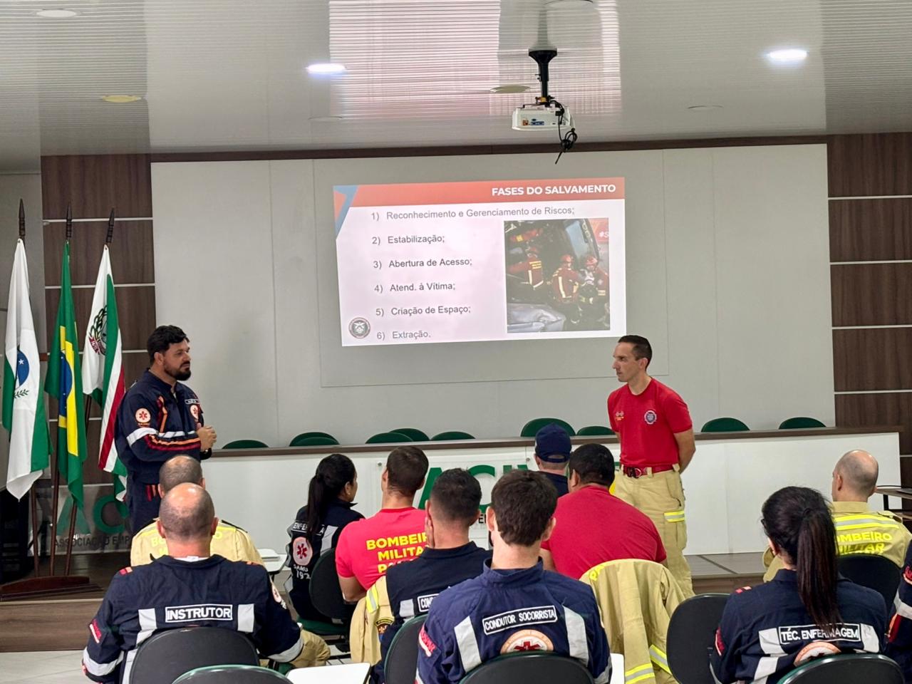 Na manhã desta terça-feira (24), equipes do Corpo de Bombeiros e do SAMU Sudoeste participaram de um treinamento integrado voltado ao salvamento veicular. A primeira etapa da capacitação foi teórica e ocorreu no auditório da Associação Comercial e Empresarial de Coronel Vivida.