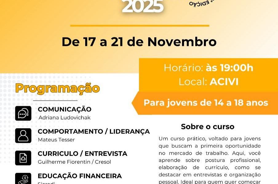 De 17 a 21 de novembro, o Núcleo do Empreendedor Jovem (NEJ) da ACIVI realiza a 2ª edição do Curso.