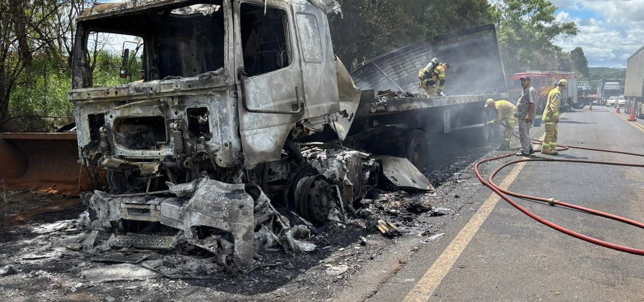 Um caminhão foi destruído por um incêndio registrado por volta das 11 horas desta quinta-feira (12) na BR-158, entre Coronel.