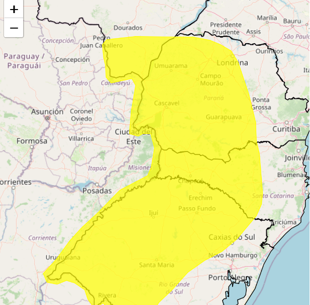 A área afetada pelo aviso inclui grande parte do Paraná, com destaque para o Sudoeste, Oeste, Centro-Sul, Norte Pioneiro e Sudeste do estado, além do Oeste de Santa Catarina e parte do Rio Grande do Sul.