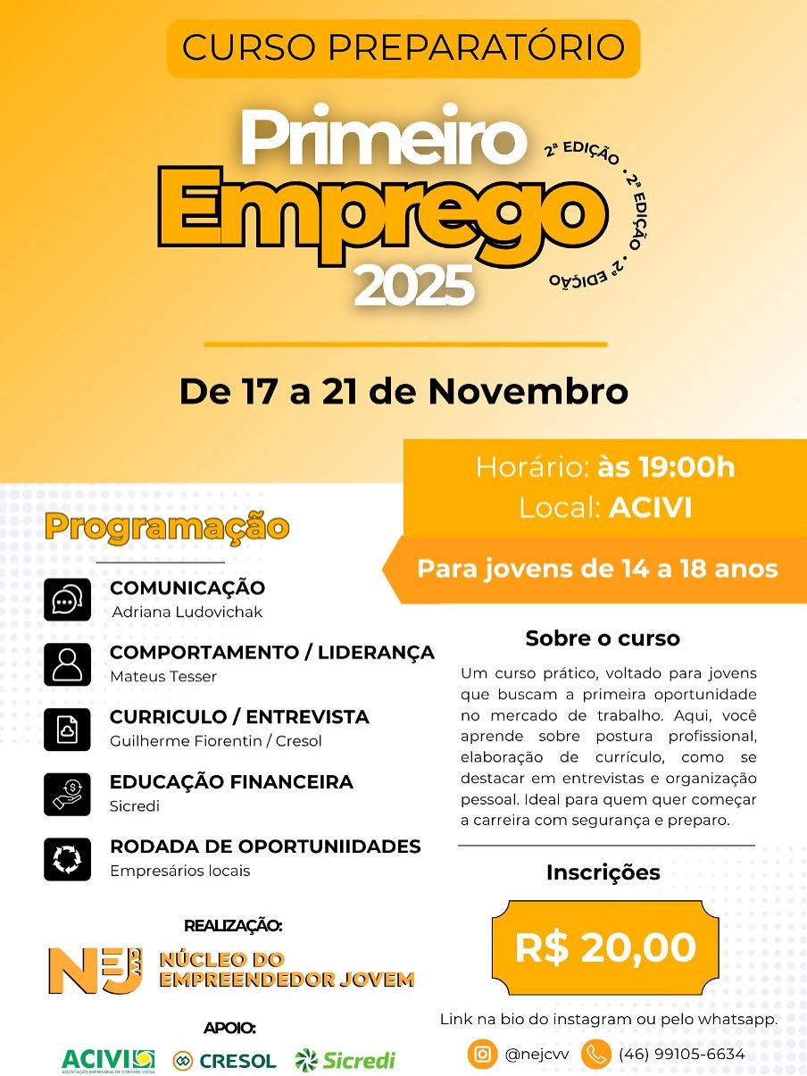 De 17 a 21 de novembro, o Núcleo do Empreendedor Jovem (NEJ) da ACIVI realiza a 2ª edição do Curso Preparatório Primeiro Emprego 2025, voltado a jovens de 14 a 18 anos que desejam se preparar para o ingresso no mercado de trabalho. Com inscrições acessíveis, no valor de R$ 20, o curso oferece uma programação prática e dinâmica, abordando temas essenciais para o desenvolvimento pessoal e profissional.