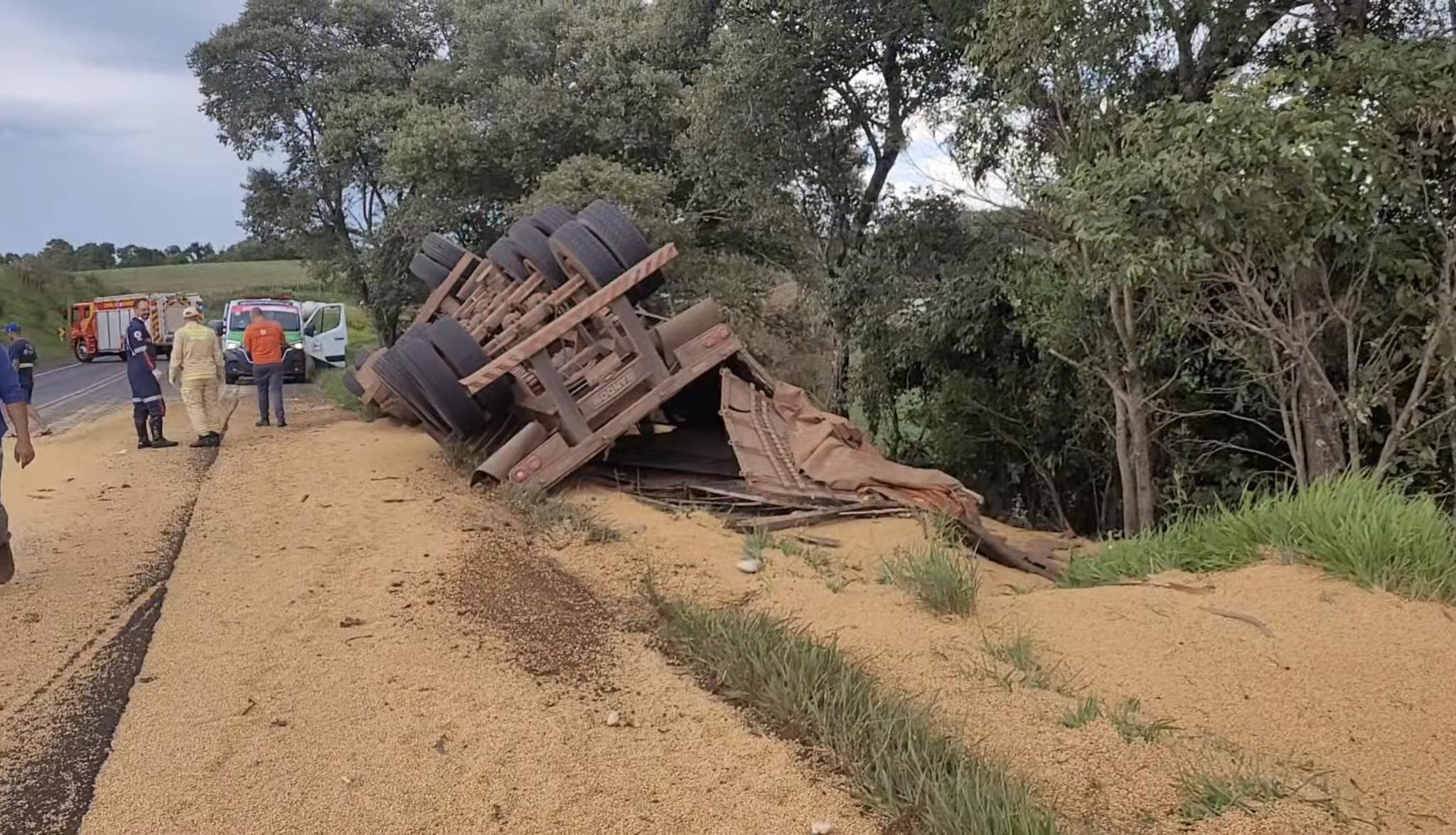 A carreta seguia pela rodovia quando o motorista perdeu o controle ao fazer uma curva e o veículo tombou às margens da pista. A carga de soja se espalhou pela rodovia e também em uma área abaixo do nível da pista, deixando o local escorregadio.